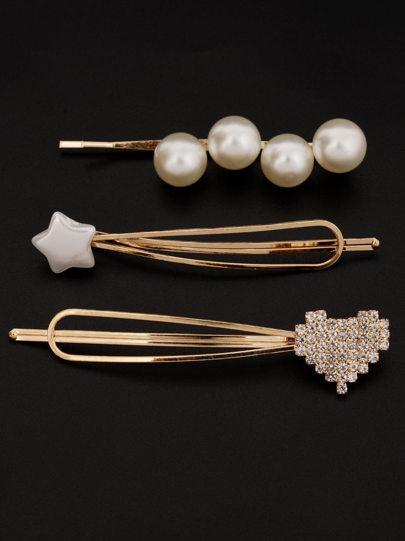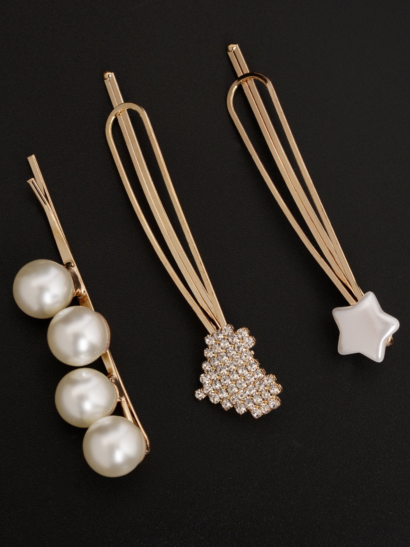 Three metallic hair pins in different designs