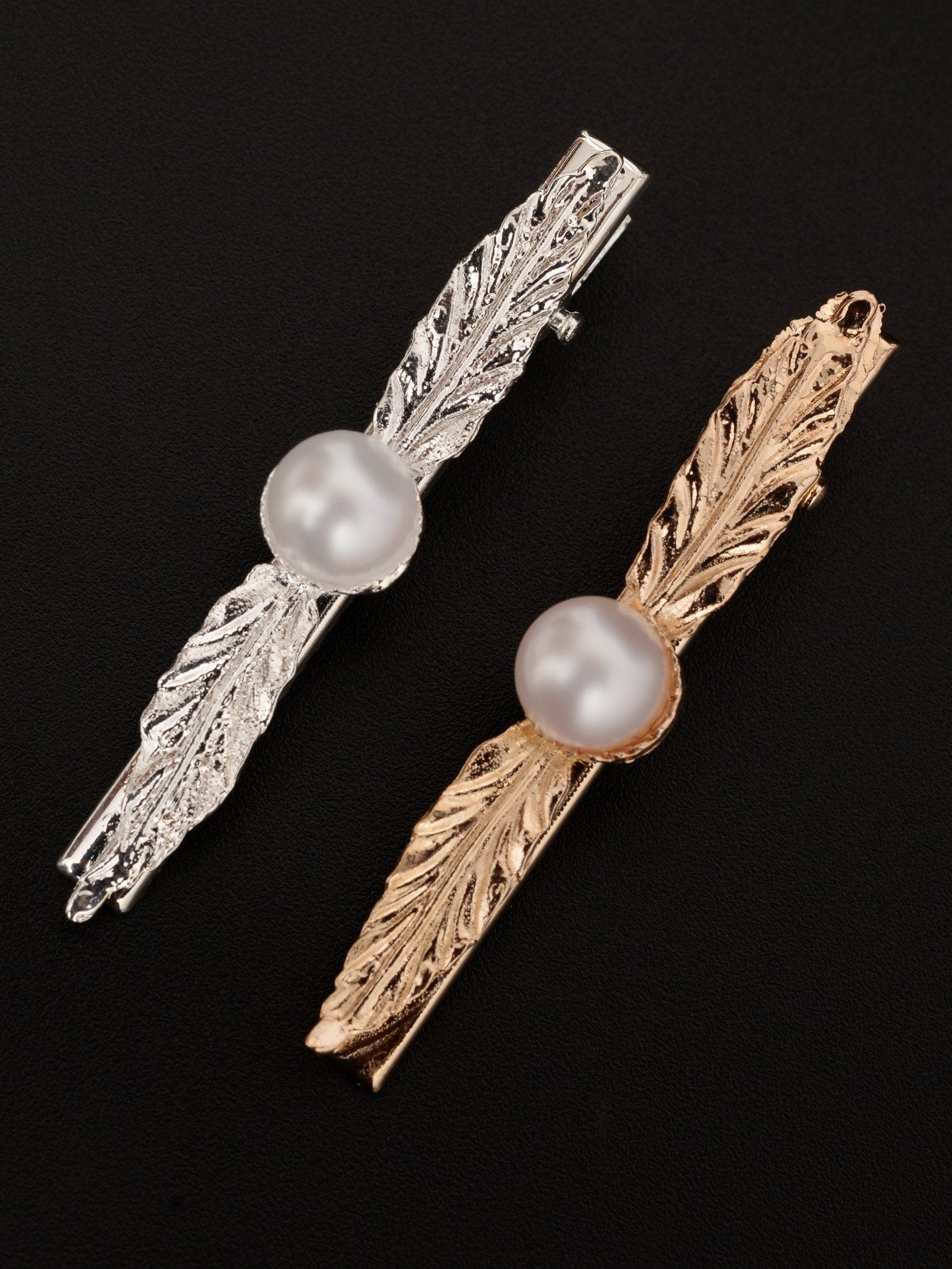 Two metallic hair pins finished with pearls